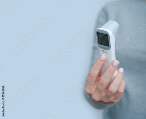 Woman holding non-contact digital thermometer in hand on gray background
