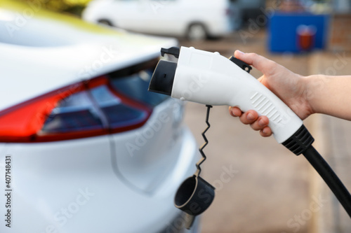 Woman holding power supply cable at electric vehicle charging station, closeup