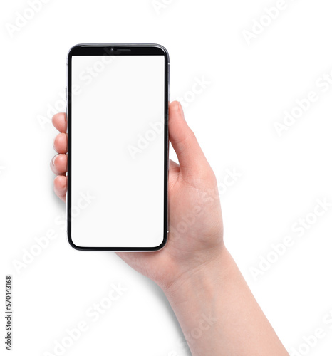 Woman holding smartphone with blank screen on white background. Mockup for design