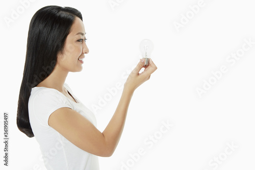 holding, smiling, color image, half face, waist up, chinese, isolated, young, woman, feminine, femininity, individual, individuality, light, illuminated, electric, inspired, inspiration, idea, cheerful, electricity, happy, happiness, asian, china, asian ethnicity, missy, one person, cut-out, casual attire, clothing, light bulb, light bulb, adults only, studio shot, lifestyle