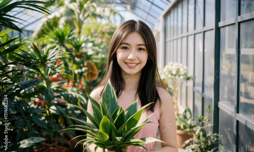 woman, plant, glasshouse, greenery, nature, gardening, indoor, sunlight, tropical, smiling, beautiful, leaf, flora, greenhouse, cheerful, portrait, young, lifestyle, fresh, vibrant, growth, environment, botanical, happy, natural, organic, potted, decoration, home, nurturing, care, wellness, healthy, serene, peaceful, bright, horticulture, foliage, environmentally friendly, sustainable, lush, arboretum