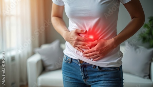Woman holds lower abdomen, red glow indicates pain. Female suffers with abdominal discomfort. Person experiences stomach ache at home, needs treatment. Healthcare concept. Sick lady feels unwell,