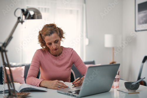 computer, laptop, notebook, cyberspace, female, blond, caucasian, person, working, work, freelancer, freelance, job, home, apartment, room, living room, desk, table, remote, typing, reading, writing, electronic mail, electronic mail, modern, alone, keyboard, technology, online, sitting, serious, bored, boring, 40s, adult, european, thinking, creative, learning, studying, book