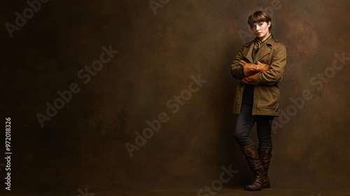 woman, female, portrait, jacket, foulard, boot, glove, pose, standing, arms crossed, looking, looking away, studio, background, brown background, adult, casual attire, style, fashion, confident, elegance, vintage, retro