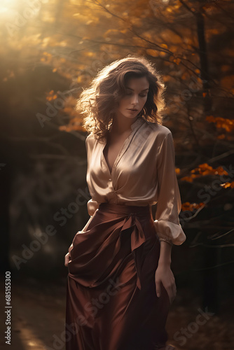 woman in a forest with autumn leaves, with sunlight filtering through the trees, wearing a beige blouse and a rust-colored skirt, ai generative