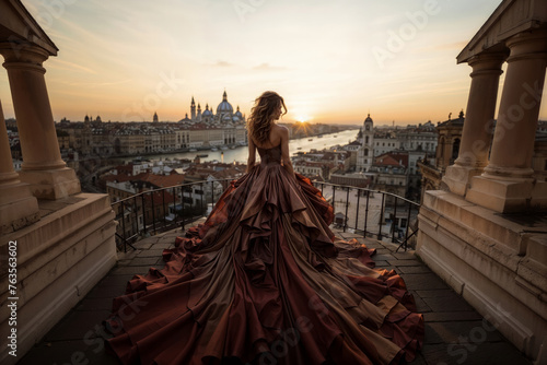 woman, gown, sunset, city landscape, elegant, european, city, skyline, view, high, vantage, point, dress, luxury, fashion, beauty, romantic, terrace, dusk, rooftop, panorama, travel, destination, silhouette, evening, atmosphere, old, town, architecture, landmark, scenic, observation, dramatic, sky, venice
