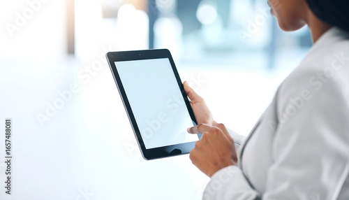 Woman in a white blazer uses a tablet with a blank screen in a brightly lit office