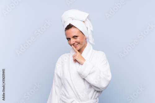 comfortable, shower, freshness, hygiene, fresh, bathe, morning, robe, natural, health, wellness, clean, white, care, bathrobe, woman, woman, people, person, lady, female, girl, studio, adult, russian, blond, background, isolated, blue, shut, up, stop, sad, doing, secret, expression, finger, gesture, gesticulate, hand, lip, mouth, mute, quiet, shh, signs, silence, silent