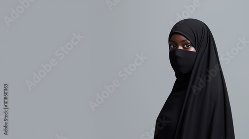 woman in black hijab and niqab stands against neutral background, exuding confidence and grace. Her eyes convey strength and poise