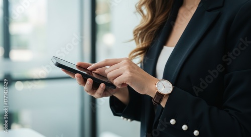 woman, blazer, smartphone, mobile phone, technology, indoor, blurred background, business, communication, hand, watch, professional, modern, device, connectivity, screen, using, browsing, cyberspace, digital, lifestyle, female, person, adult, office, work, corporate, elegant, style, fashion, clothing, jacket, caucasian, brown hair, closeup