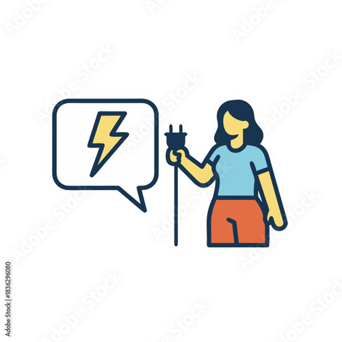 Woman in Blue Shirt and Orange Pants Holding Power Cord with Yellow Lightning Bolt Symbol in Speech Bubble Representing Energy Concept