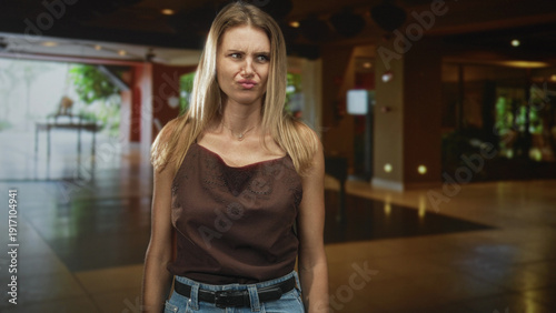 woman, necklace, grimace, lobby, blond, young, caucasian, hotel, casual attire, denim, disgust, lip, expression, gesture, reaction, posture, pendant, jean, belt, camisole, female, standing, sulk, top, hair, neck, jewellery, floor, plant, table, light, window, indoor, accessory, sleeveless, neckline, youth, casual clothes, chain, public, wearing, grimacing, pursed, unsmiling, neutral, ambient, lighting, scene, belt loop