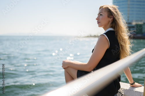 sunlight, sunshine, high-coloured, woman, pier, young, sea, person, happy, woman, looking, single, balance, people, beach, female, summer, travel, spring, view, ocean, nature, beautiful, white, vacation, relax, backside, introvert, blue, adult, caucasian, sky, healthy, water, holiday maker, casual attire, scene, peace, enjoy