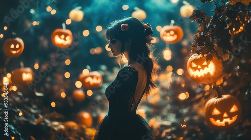 Woman in Enchanted Forest Surrounded by Glowing Jack-o'-Lanterns
