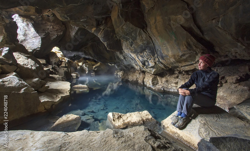 cave, geothermal, pool, woman, to sit, alone, iceland, scenic, landscape, travel, vacation, trip, nature, destination, nordic, europa, tour tourism, landmark, famous, game