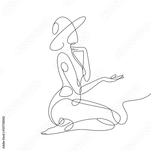 woman, figure, art, drawing, vignetting, minimalist, abstract, line, continuous, single, outline, elegant, graceful, pose, sitting, kneeling, hat, fashion, style, beauty, feminine, sensual, alluring, mysterious, contemplative, thoughtful, gesture, hand, arm, body, form, shape, curve, fluid, organic, simple, clean, modern, graphic, design, illustration, vector, white, background, black, ink, artistic, creative