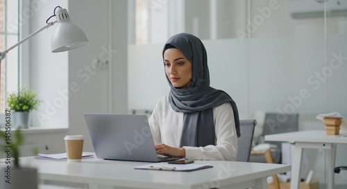 Woman in hijab working on laptop at desk with lamp and coffee in bright modern office setting