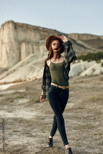 desert, woman, jean, hat, walking, mountain, sky, blue, clear, majestic, adventure, landscape, nature, outdoors, remote, exploration, freedom, solo, journey, scenic, view, dry, arid, hiking, trekking, dune, copy space, harmony, calmness, peaceful, solitude, southwest, stride, horizon, discovery, wild, huge, beauty, travel, explore, recreational, leisure