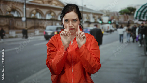 woman, jumpsuit, orange, outdoors, street, nervous, car, tied-up, people, background, scene, urban, expression, emotion, city, traffic, brunette, female, prisoner, gesture, fear, public, daylight, action, pedestrian, interaction, environment, scenario, setting, attire, costume, portrait, character, reaction, surrounding, context, situation, moment, location, standing, outfit, mood, crowded, city landscape