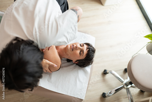 adjust, alternative, body, chiropractor, clinic, eyes closed, indoor, lifestyle, medicals, office, osteopath, pain, patient, physical, physical therapy, procedure, rehabilitation, relaxation, short hair, treatment, work, workplace