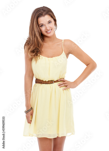 woman, portrait, smile, fashion, beauty, female, young, isolated, model, posing, summer, dress, clothes, designer, glamour, stylish, yellow, confidence, transparent, free, girl, face, beautiful, happy, hair, alone, adult, skin, youth, 1, standing, looking, attractive, brunette, person, healthy, confident, pose, success, style, trendy, good, relax, elegant, clothing, cool, happiness, colours