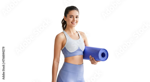 woman, activewear, yoga, mat, blue, smiling, camera, fitness, exercise, health, wellness, active, lifestyle, physical exercise, body, slim, girl, indoor, portrait, ponytail, attractive, healthy, training, sport