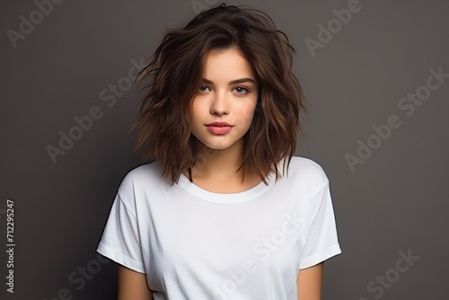 advertisement, model, shirt, print, posing, t, advertising, front, up, casual attire, brand, label, guy, lady, textile, wear, standing, 20s, outfit, promotion, tee, product, realistic, t-shirt, white shirt, advert, stylish, fashion, chest, placeholder, isolated, showcase, photo, editable, material, short, show, woman, female