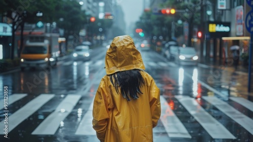 woman, rain, city, street, raincoat, yellow, walking, urban, wet, pavement, crosswalk, asphalt, city landscape, street light, building, traffic, car, corner, rainy, day, grey, sky, fog, mist, weather, water, sidewalk, background, downtown, lighting, photo, photo, image, outdoors, daytime, travel, journey, life