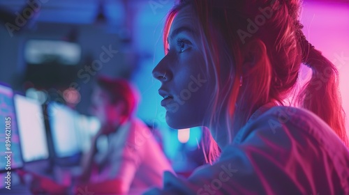 Woman is staring at a computer screen in an office with futuristic lighting.