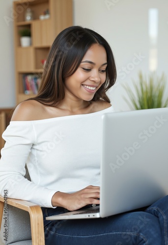business, woman, laptop, work, working, white, cheerful, office, background, to sit, sitting, use, using, chair, closeup, african, american, cyberspace, technology, smiling, looking, blue, colours, beige, notebook, businesswoman, online, person, smile, plant, communication, lifestyle, casual attire, computer, men at work, professional, success, home, job, beauty, student