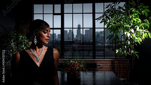woman, jewellery, fashion, portrait, elegance, diamond, luxury, accessory, model, style, chic, beautiful, glamour, urban, city, view, window, interior, black, dress, elegant, gem, diamond, necklace, earring, stylish, modern, silhouette, dark, light