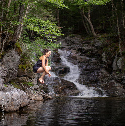 Woman jumping into water near Thirteen Falls, White Mountains, New Hampshire, USA