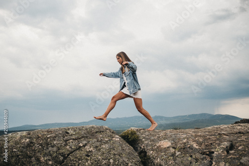 woman, rock, jump, beauty, barefoot beach, leap, nature, dress, scenic, casual attire, body, cliff, harmony, cloudy, contemporary, landscape, posture, travel, sky, formation, denim, environment, fresh, alone, blond, jacket, freedom, fly, motion, vacation, vitality, style, vale, modern, summer, copy space, half face, horizontal