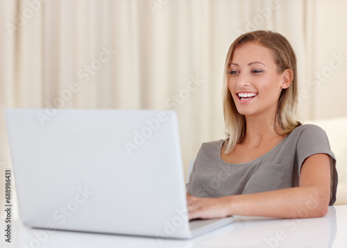 Woman, laptop and happy for remote work from home, ideas and thinking with freelance copywriting job. Girl, computer and entrepreneur with planning, schedule and brainstorming with reading in house