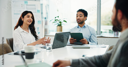 Woman, laptop and team at office meeting with review, insight or smile with report at finance company. Group, staff and planning with strategy, asset management and feedback at investment agency