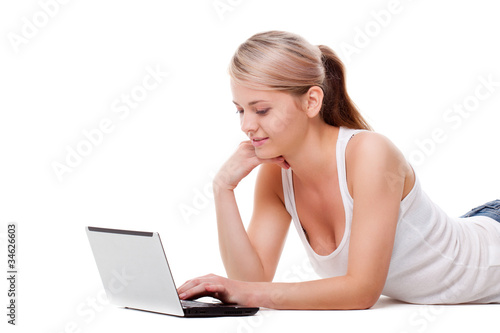 adult, background, beautiful, beauty, business, casual attire, caucasian, cheerful, colours, computer, concept, cute, education, emotion, expression, female, floor, fun, hair, hand, happiness, happy, human, cyberspace, jean, joyful, laptop, laying, leisure, looking, notebook, 1, people, person, portrait, pretty, smile, smiling, student, studio, technology, using, white, woman, woman, working, young