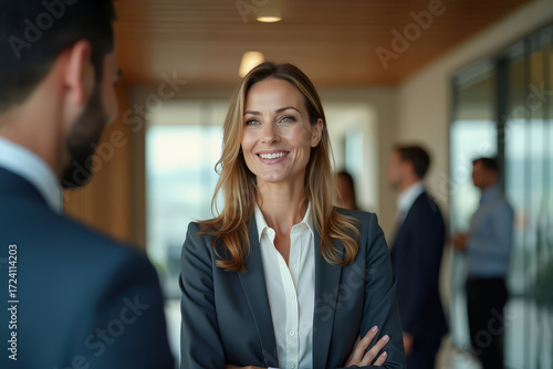 Woman leader smiling. Office businesswoman standing. Confident professional female.