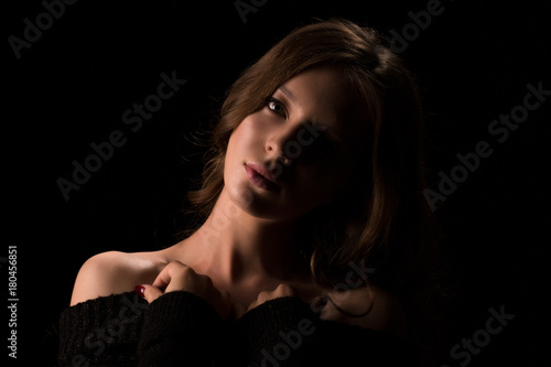 Woman lighted half face, portrait of young light hair model woman posing on black background in studio