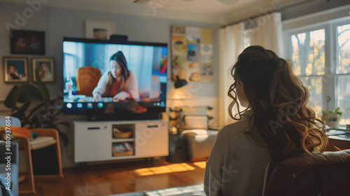 woman, video, call, home, living room, listening, television, screen, remote, work, meeting, technology, online, communication, focused, attention