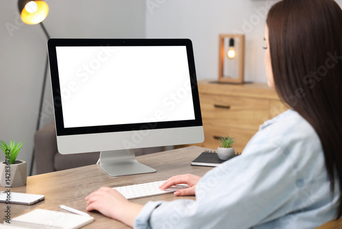 Woman looking at monitor with blank screen at wooden table indoors. Mockup for design