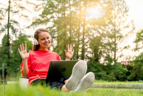 woman, laptop, park, wireless, technology, mobile, portability, modern, green, grass, red, summer, smiling, lifestyle, city life, caucasian, young, outdoors, recreation, sitting