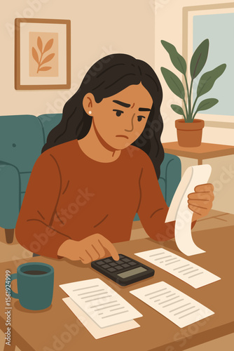 finance, budgeting, bill, calculating machine, paperwork, expense, household, woman, home, accounting, money, payment, calculation, debt, savings, invoice, receipt, personal finance, economy, cost, spending, analysis, tax, organisation, management, modern, flat, vector, illustration, lifestyle, living room, hot drink, table, document, planning, home office, adult, responsibility, independence, business, working, review, expense, cosy, interior