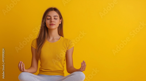 Woman meditating in lotus pose against bright yellow background, promoting mindfulness, relaxation, and mental well-being through yoga and meditation practices