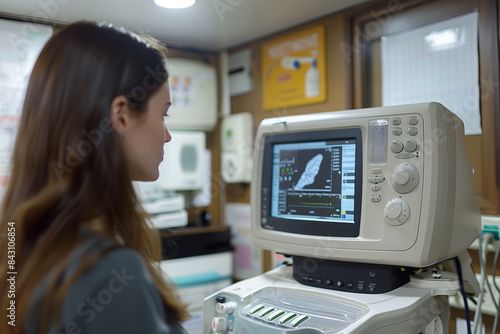 Woman Observing Medical Equipment Monitor in a Healthcare Setting