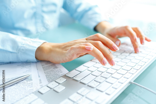 Woman office worker typing on the keyboard