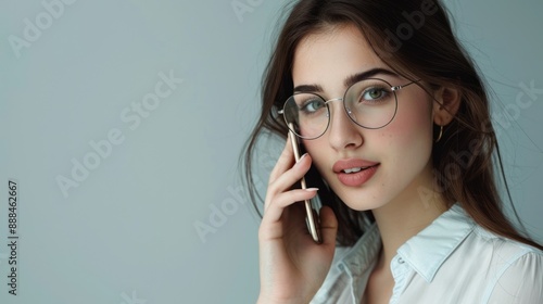 woman, phone, call, talking, goggles, eyeglass, portrait, female, model, fashion, communication, business, professional, beautiful, attractive, style, hair, smile, white, shirt, closeup, face, studio, background, grey, blue, green, eye, make-up, lip, skin, earring, hand, finger, technology, modern, trendy, young, adult, casual attire, photo, image, photo