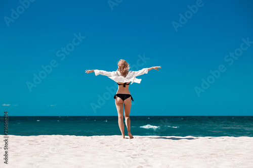 single, lifestyle, ocean, travel, summer, vacation, water, sky, beach, woman, sea, girl, sunlight, tropical, sand, space, female, nature, sunny, people, person, young, tan, paradise, beautiful, coast, back, body, beauty, slim, background, white, sunshine, horizon, relaxation, season, outdoors, cheerful, relax, wind, blue, model, happy, alone, breathing, rear, blouse, lingerie, bikini