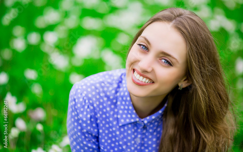woman, outdoors, nature, park, summer, happy, happiness, girl, female, to sit, rest, relax, meadow, flower, grass, green, spring, farm, field, colours, cheerful, joy, joyful, caucasian, casual attire, fun, bright, warm, leisure, spend, time, outside, bloom, blossom, natural, relaxation, smiling, enjoy, beautiful, attractive, pretty, young, youth, forest, blue, dress