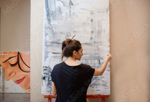 woman painter in her art studio paint an abstract picture with her brush