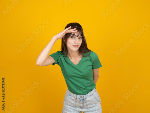woman, searching, distance, looking, yellow, hand, forehead, young, curious, 20s, up high, attractive, away, background, beautiful, beauty, brunette, camera, caucasian, closeup, colours, concept, copy space, cute, expecting, expression, eye, face, far, female, girl, green, hair, hold, human, isolated, lady, long, model, people, person, portrait, positive, pretty, profile, smiling, t-shirt, teenage